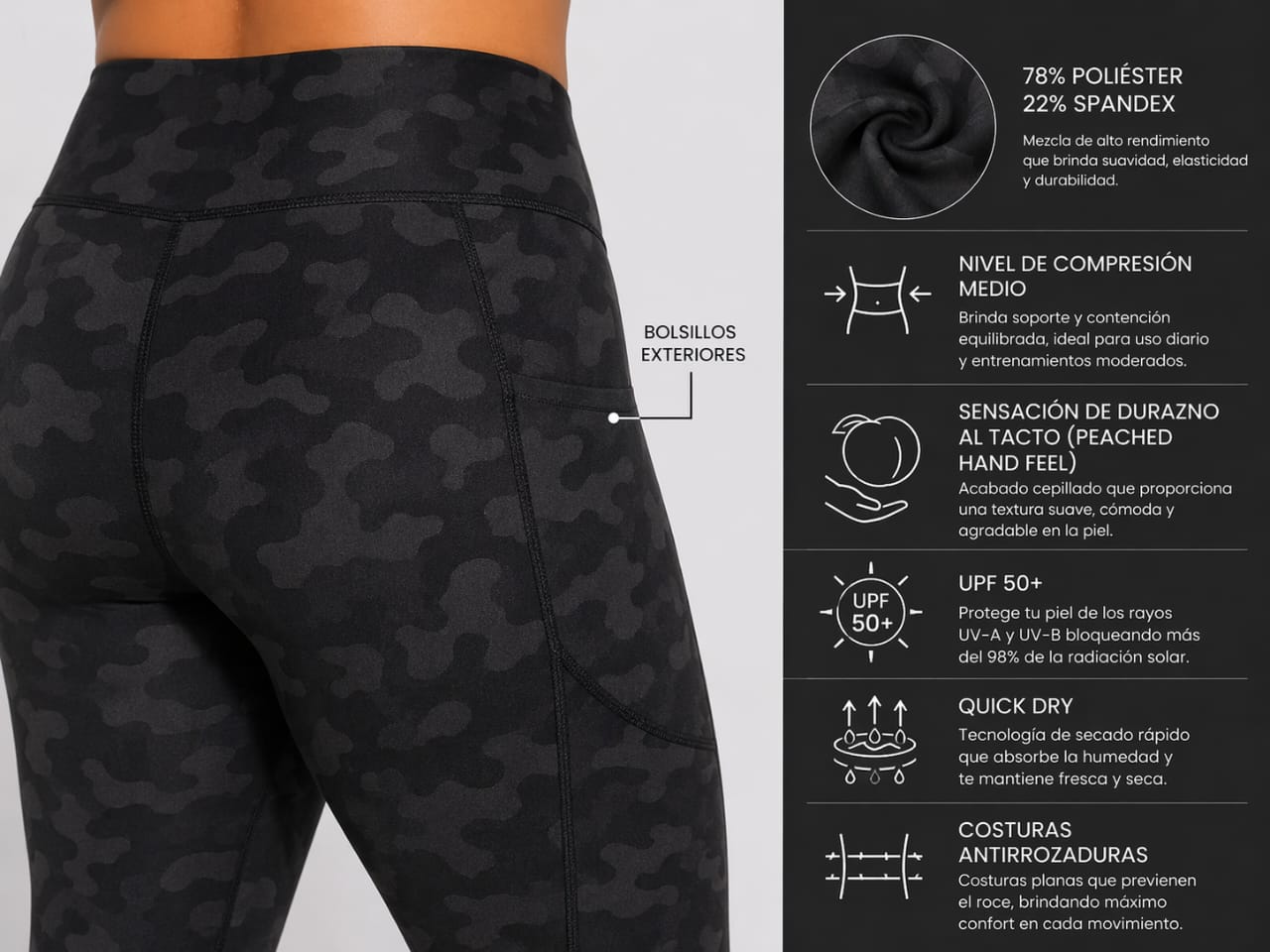 | Estilo | 7/8 Ankle (Tobillero), Tiro Alto (High-Rise) |