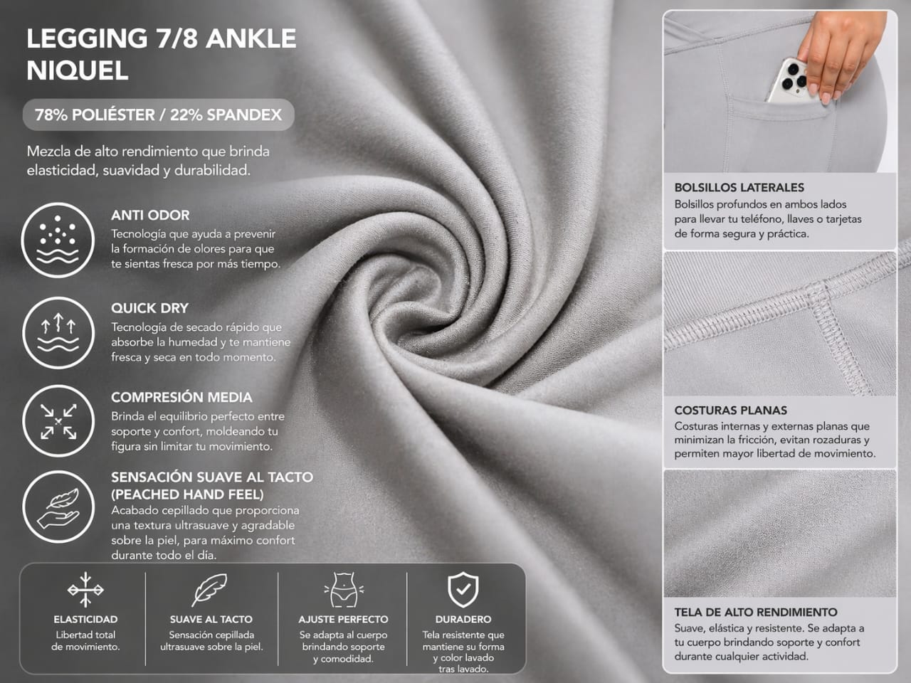 | Estilo | 7/8 Ankle (Tobillero), Anti Olor, Tiro Alto (High-Rise) |