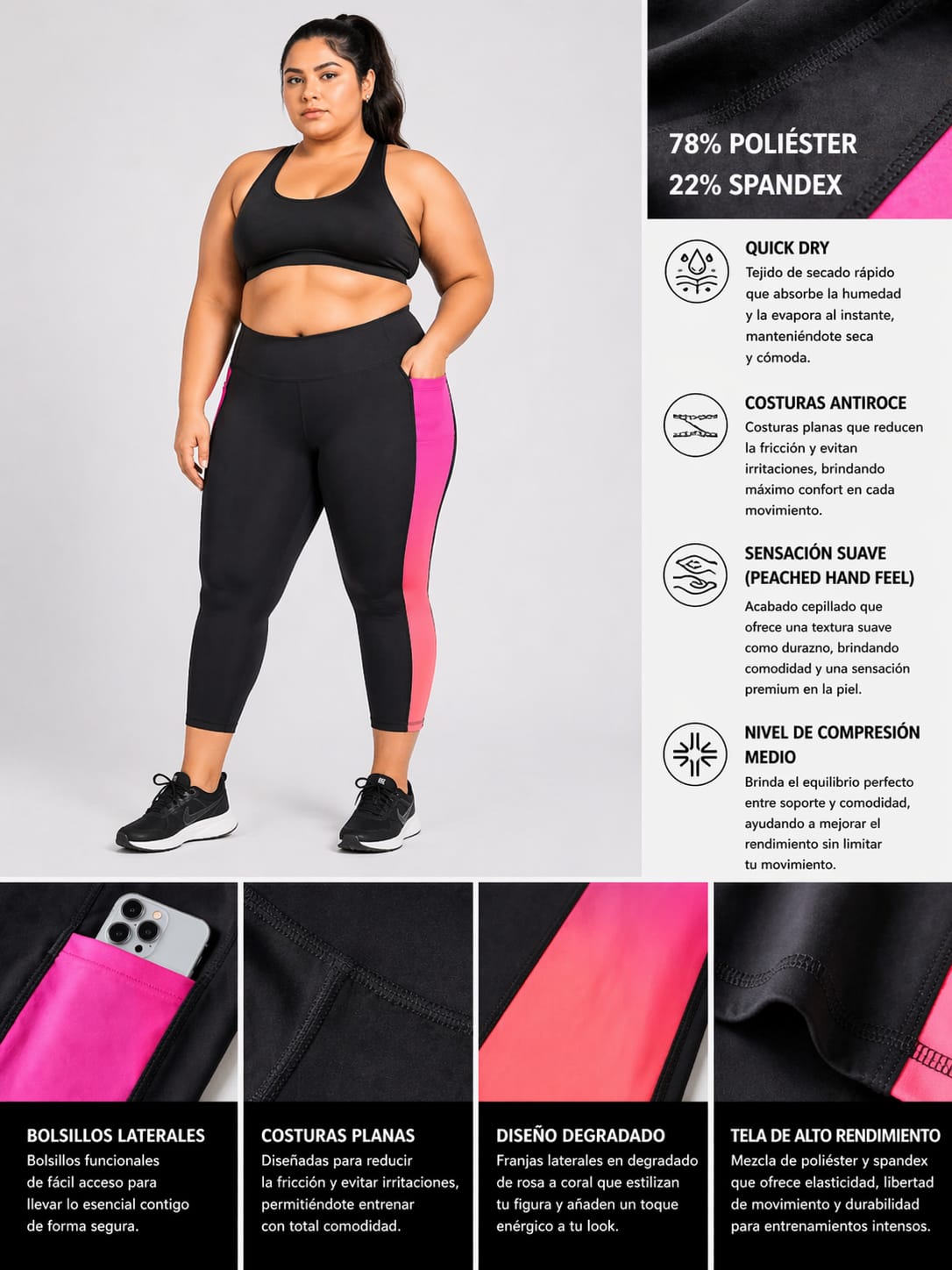 | Color | Franjas Degradadas laterales de Rosa a Coral, Negro |